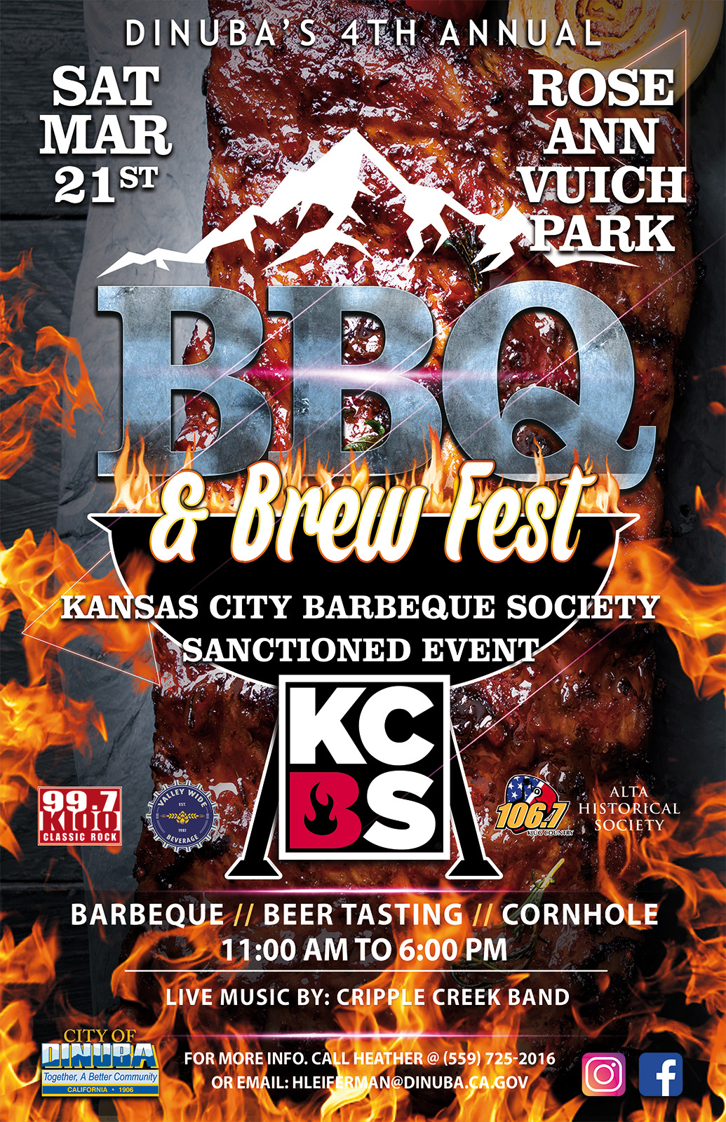 The 2026 BBQ & Brew Fest will be held on March 20th & 21st 2026 at Rose Ann Vuich Park. This will be our Fourth Annual BBQ & Brew Fest and will be attended by thousands. For more information please contact Heather Leiferman at (559)725-2016 or hleiferman@dinuba.ca.gov